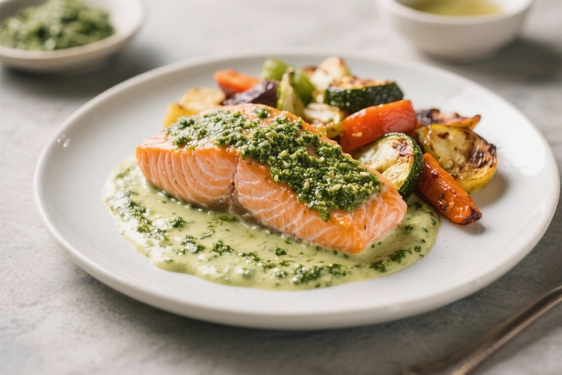 This is the kind of weeknight dinner that feels like a treat but doesn’t ask much of you. Tender salmon bakes in a creamy basil pesto sauce while a tray of colorful veggies turns golden and sweet in the oven. It’s simple, fast, and full of big flavor. Best of all, it’s high in protein and healthy fats, so you’ll feel satisfied without the heaviness. If you need a reliable go-to dinner, this one delivers. Why This Recipe Works One pan for salmon, one tray for veggies: Everything cooks in the oven at the same temperature, so timing is easy.…