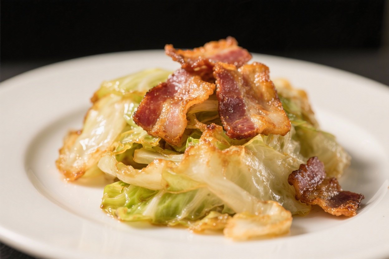 Overhead “tasty top view” of the finished Fried Cabbage and Bacon plated as a rustic main: gener